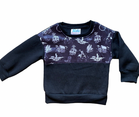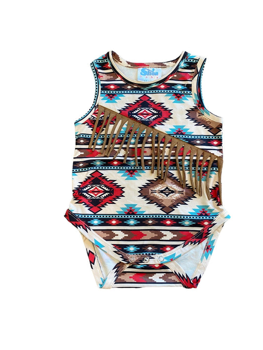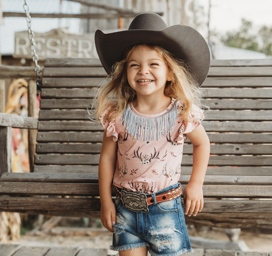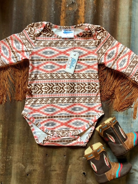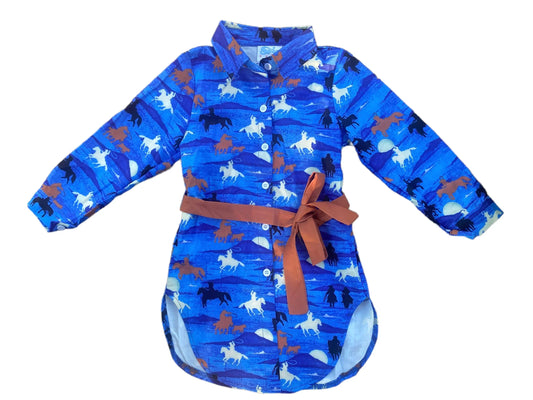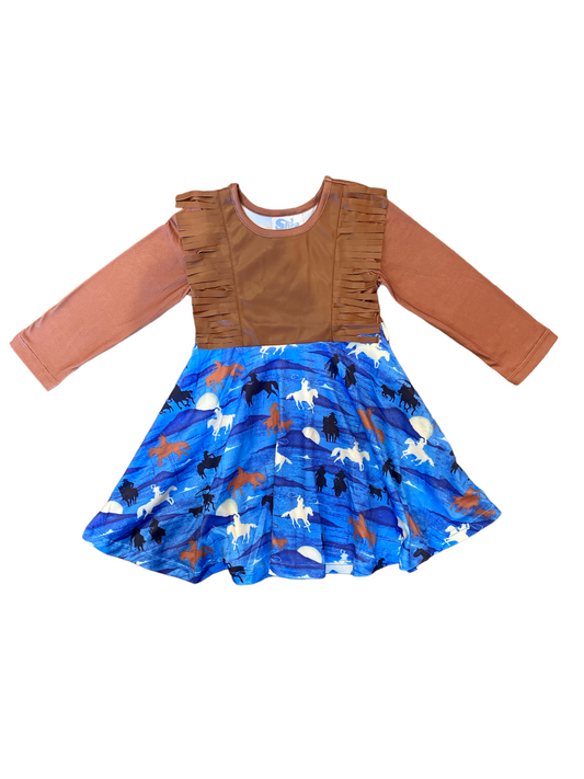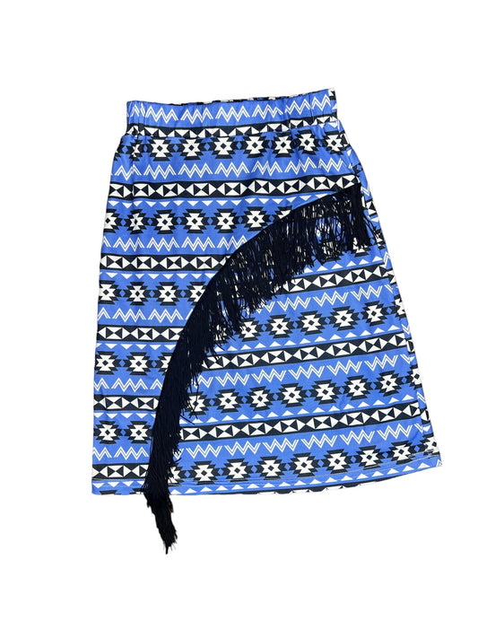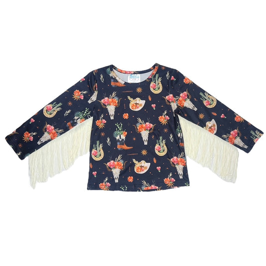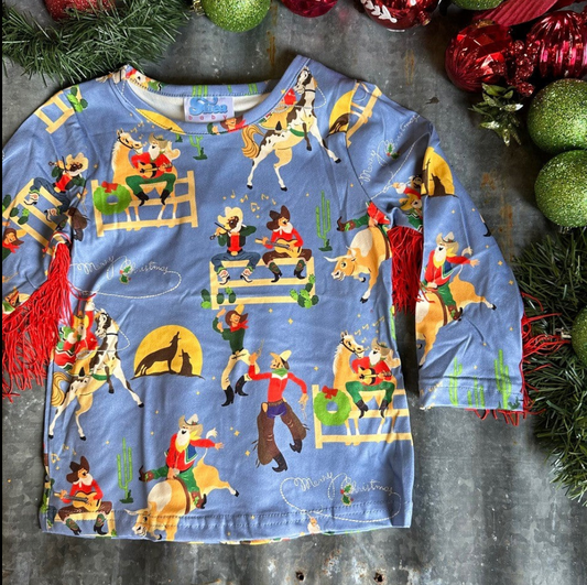 Blue Long Sleeve Cowprint with Fringe Shirt