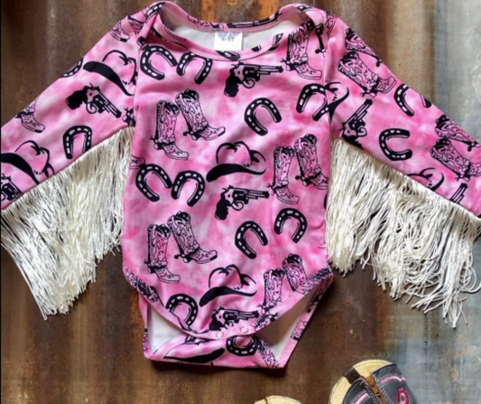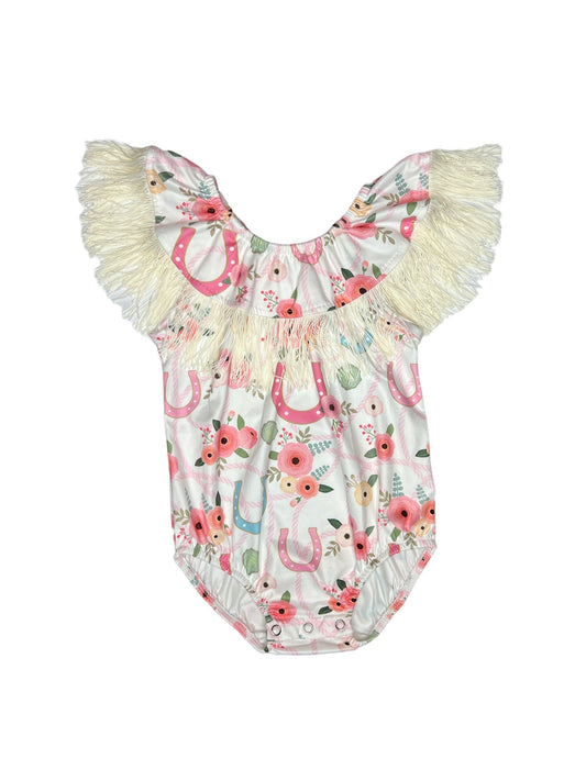 Pink Horseshoe & Rose With Fringe Long Sleeve Onesie