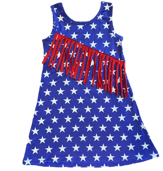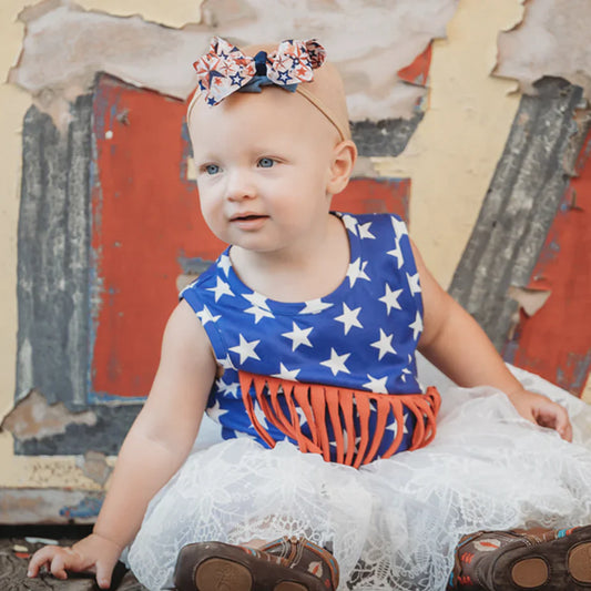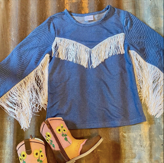 Blue Long Sleeve Cowprint with Fringe Shirt